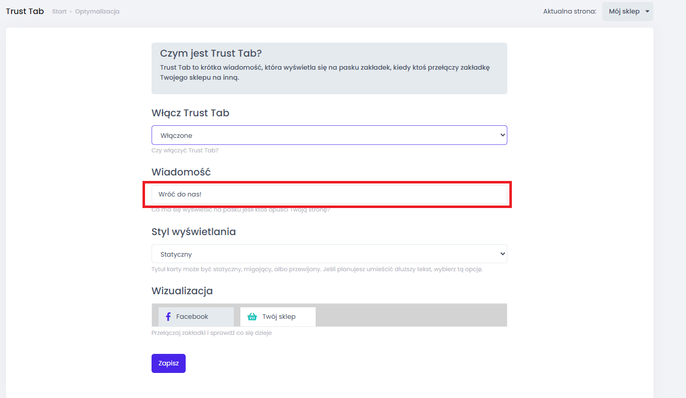 W Trust Tab możesz stworzyć własny, unikatowy komunikat . Wpisz hasło, które przyciągnie uwagę: "Wróć do nas" "<3 Tęsknimy!" "Tutaj Twój koszyk z..." - wyróżnij się i spraw, aby użytkownik nie zamknął zakładki Twojego sklepu.